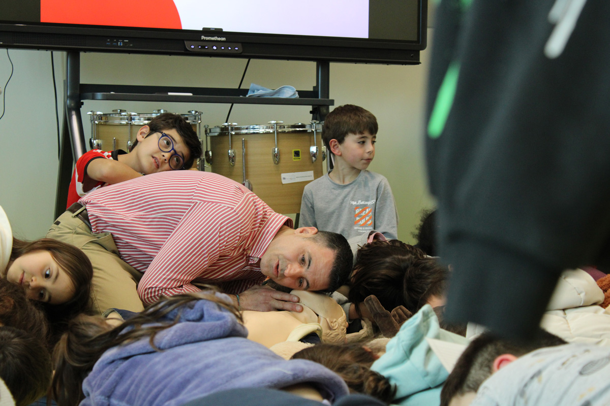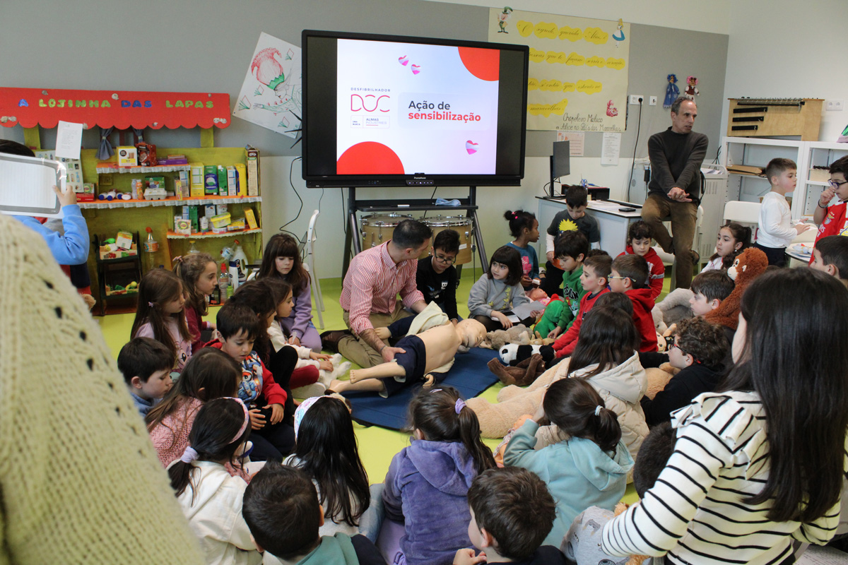 Para tornar a aprendizagem mais dinâmica e acessível às idades presentes, foram também realizadas simulações práticas, onde os alunos puderam assistir e participar numa demonstração de manobras de Suporte Básico de Vida (SBV).