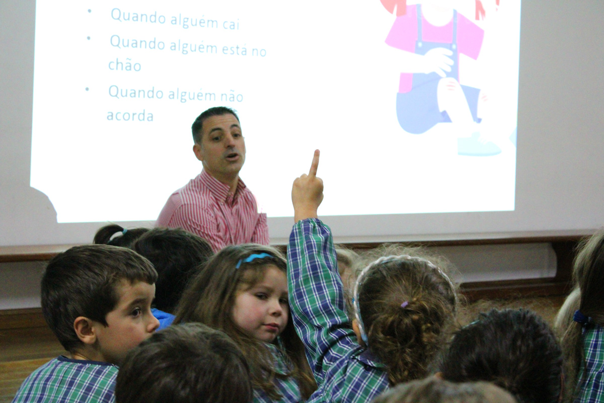 A sessão incluiu ainda uma breve demonstração de manobras de Suporte Básico de Vida (SBV), permitindo que as crianças observassem, de forma lúdica, algumas das ações que podem ser realizadas numa situação de emergência.